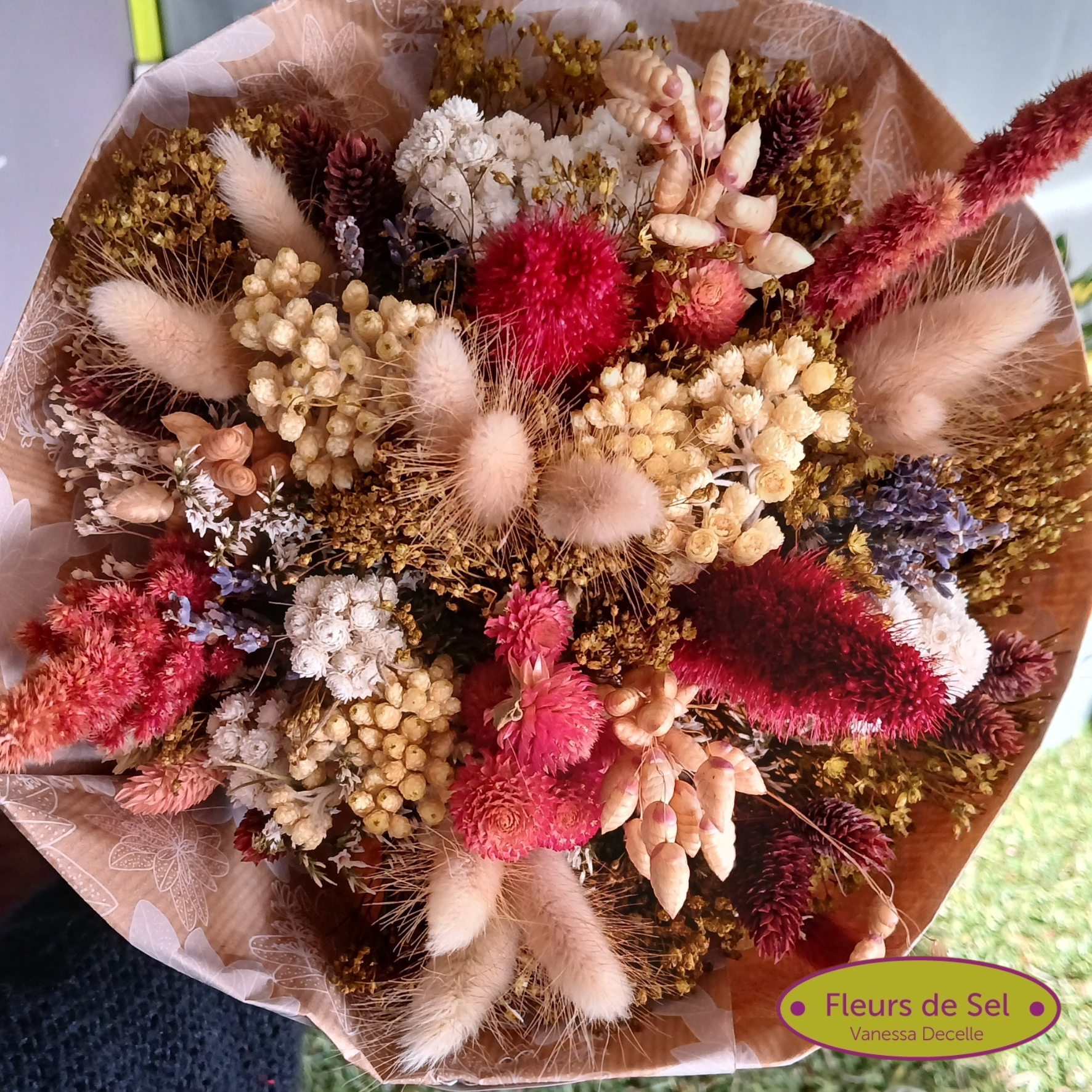 Bouquet de fleurs séchées d’environ 22cm de diamètre.