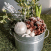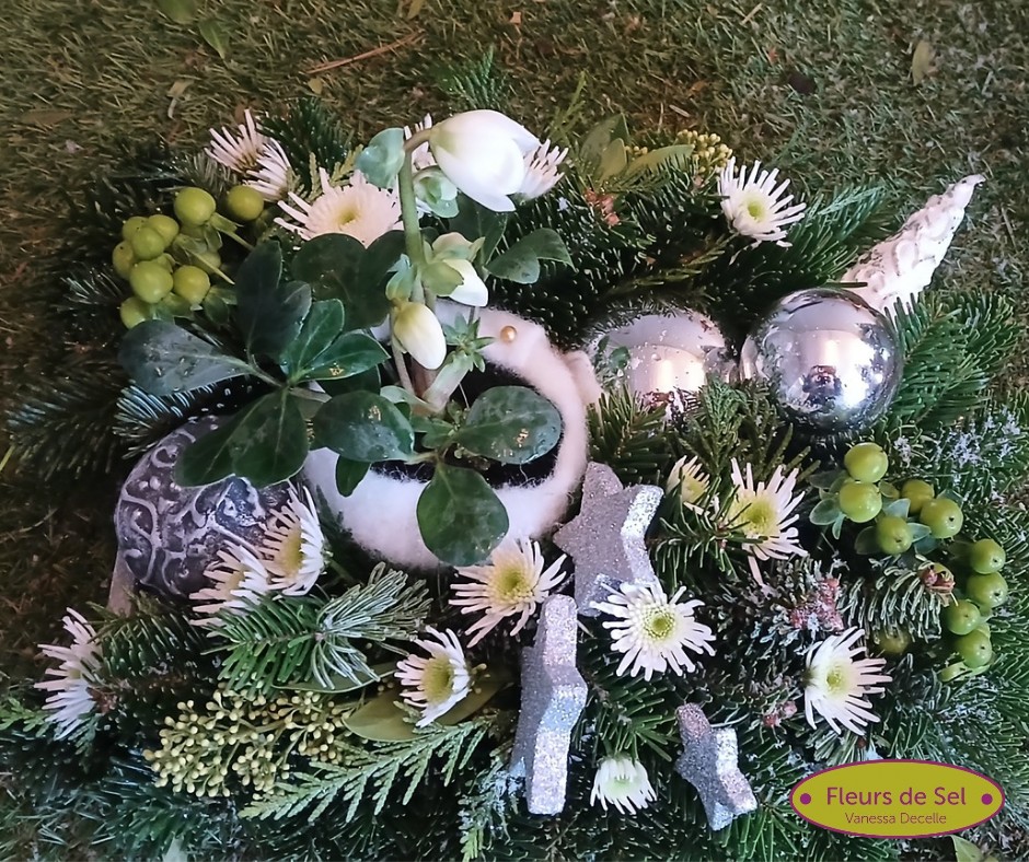 Milieu de table allongé d’environ 25cm de long composé de décorations argentées, fleurs blanches et une Héllebore.