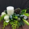 Milieu de table allongé d’environ 25cm de long réalisé dans un pot en metal argenté. Montage enneigé composé de Lys, Roses, Ornithogalum et décoration de Noël.