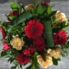 Bouquet vert et saumon. Bouquet rond, court, d’environ 25cm de diamètre. Le choix des couleurs sera respecté mais le choix des fleurs est fonction de la saison.
