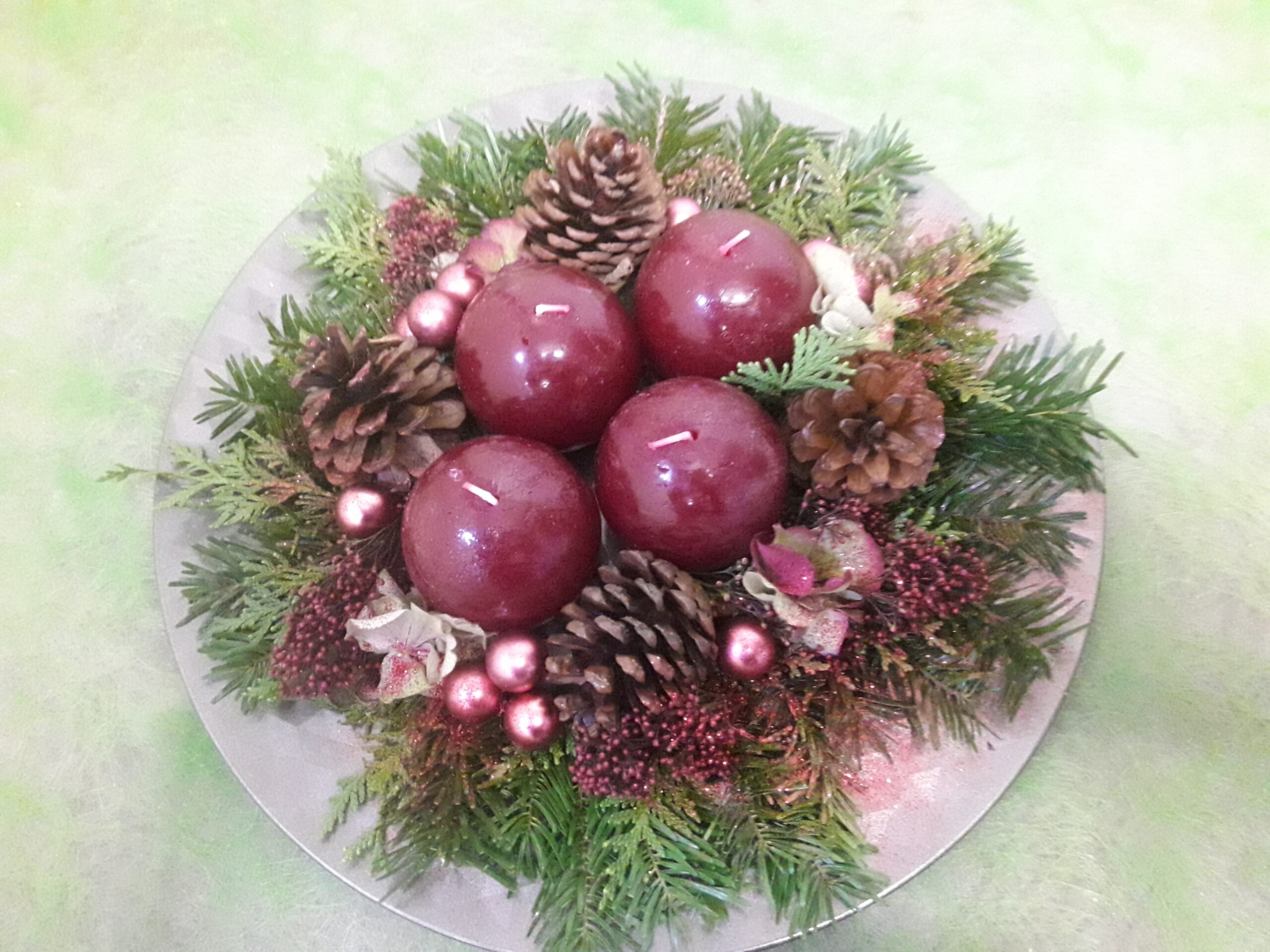 Montage rond sur assiette de 30cm de diamètre composé de 4 bougies rouges et de déco rouges. Tiendra toutes la période des fêtes.