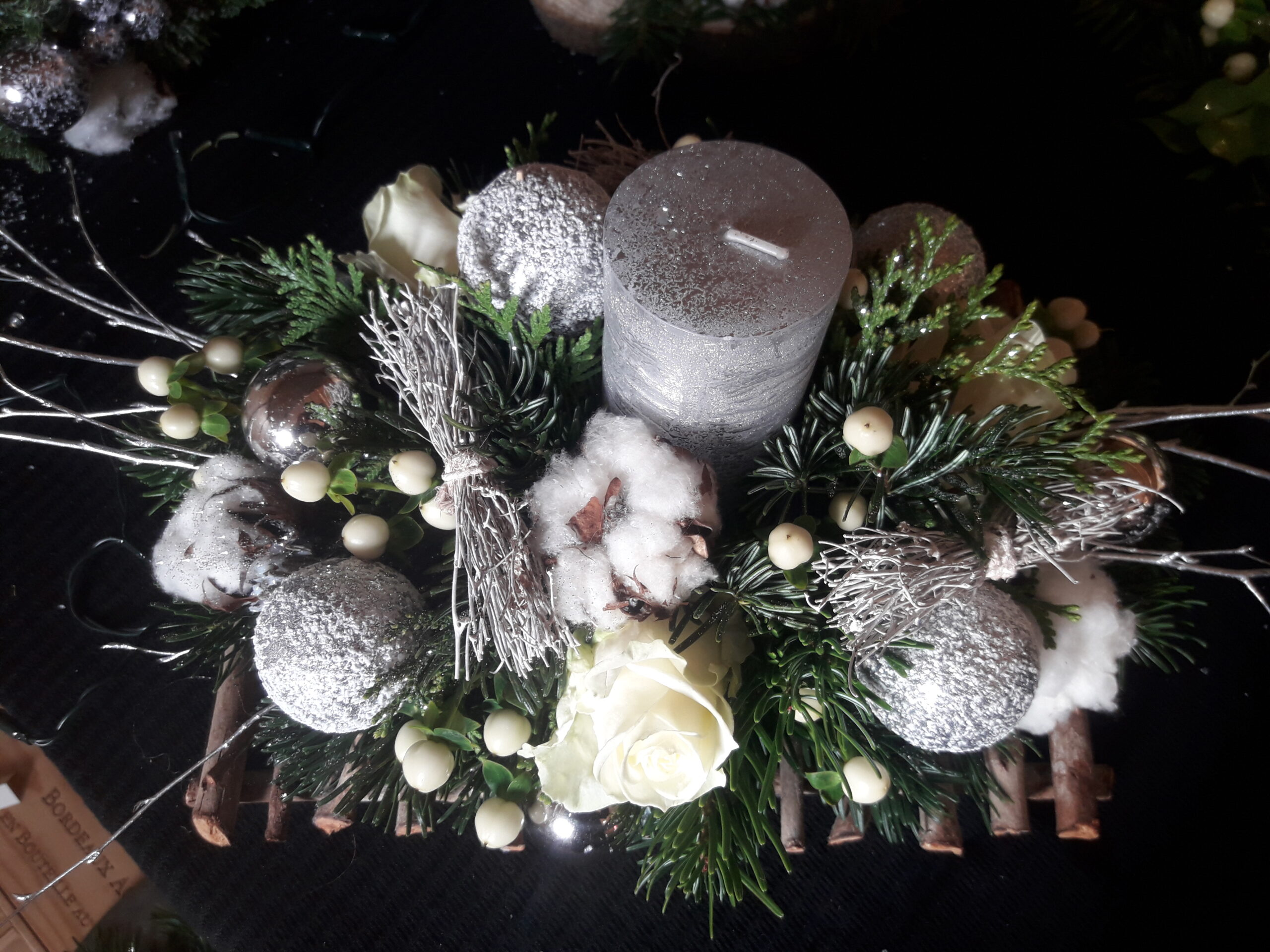 Milieu de table réalisé sur une structure en bois dans les tons blanc et argent.